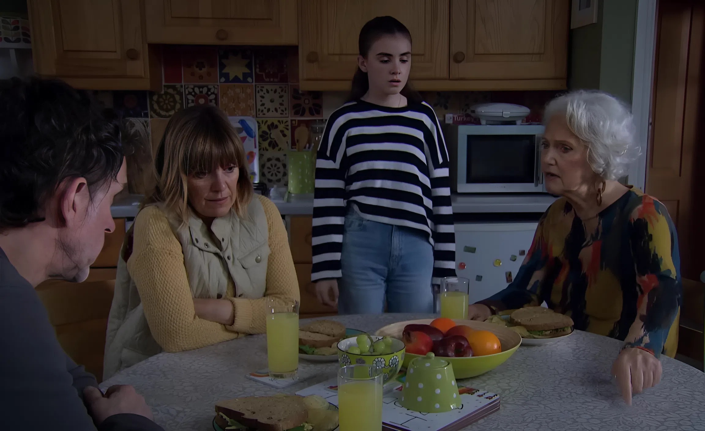 Just when things seem hopeless, April’s grandfather, Bob Hope (Tony Audenshaw), steps in. Understanding Marlon’s fear and April’s pain, Bob offers a compassionate solution: April can move in with him in Cathy’s room. Bob cleverly assures April that she would be doing him a favour by keeping him company. April accepts, and the crisis temporarily subsides with April moving in with her grandad.