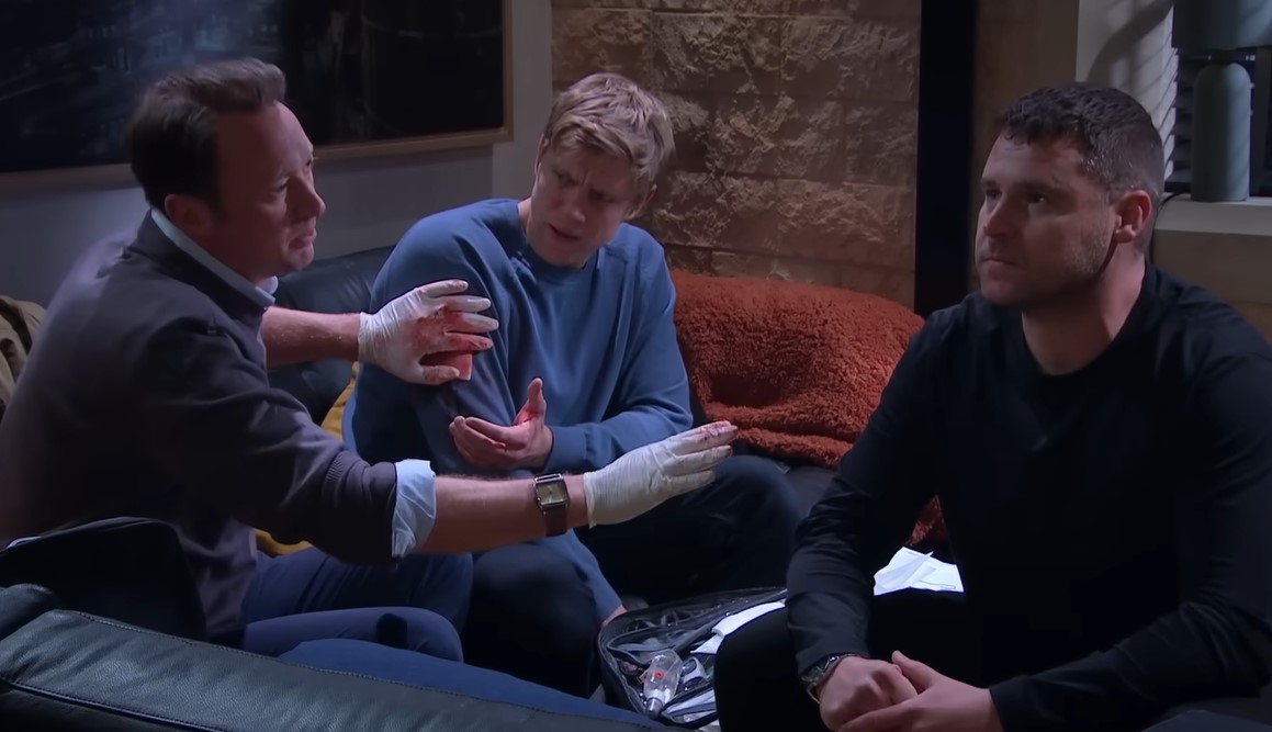 As Kev lashed out, he lunged toward Aaron—but Robert stepped in between them and took a slash to the arm. Liam immediately jumped into action, tending to the wound and trying to defuse the escalating tension.