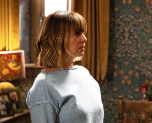 One of the most haunting images to be revealed in the flashback episodes is the moment Rhona is home alone, consumed by despair after April’s disappearance. As her fear reaches its peak, a shadowy figure appears behind her.